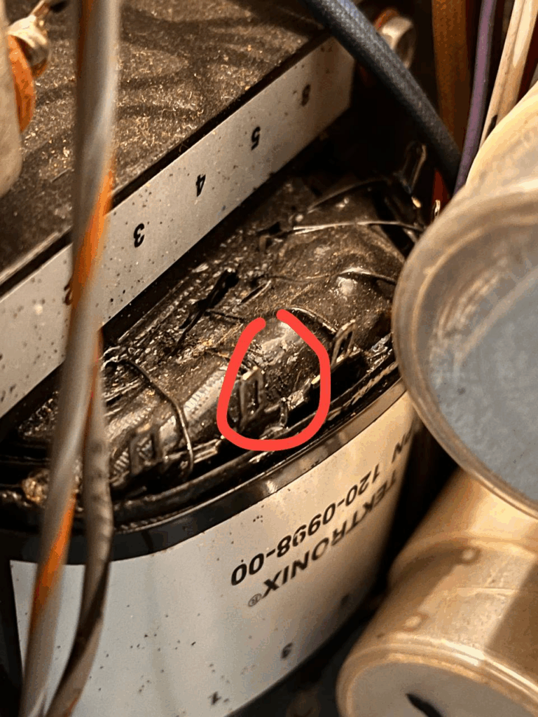 It’s kind of visible in this photo, there are wires going from the transformer to the tabs to select voltages and one was broken. Luckily there was enough wire left to solder on and fix it, getting a replacement would have been impossible! After this fix, I got power! I disconnected as much as I could in order to check all the voltages I could check. We need 15V, 12V, 5V, -12, +20, -20 +185 and +365 and they turned out to all be in spec. Tektronix :)