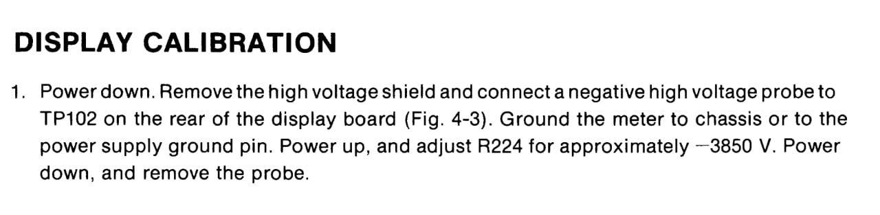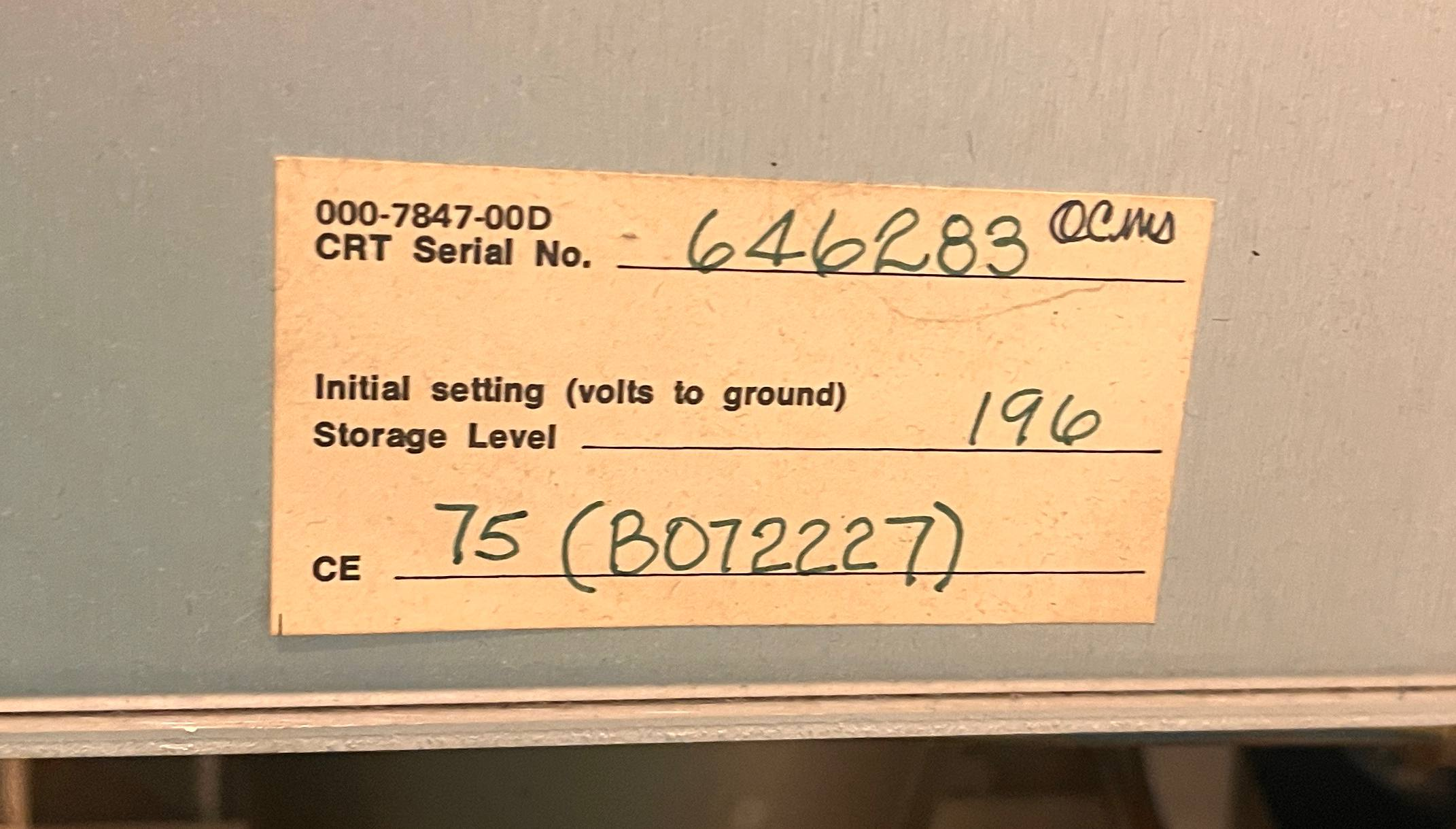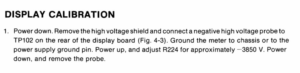Luckily I have a HV scope probe on loan from a friend! And the HV is in spec. So that’s good, but all the other voltages are not. These CRTs are pretty sensitive to all the needed voltages, sensitive enough that they are calibrated in the factory and the voltages for the exact CRT are written on them:
